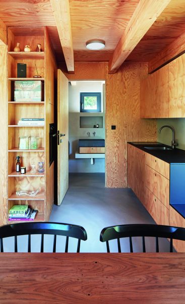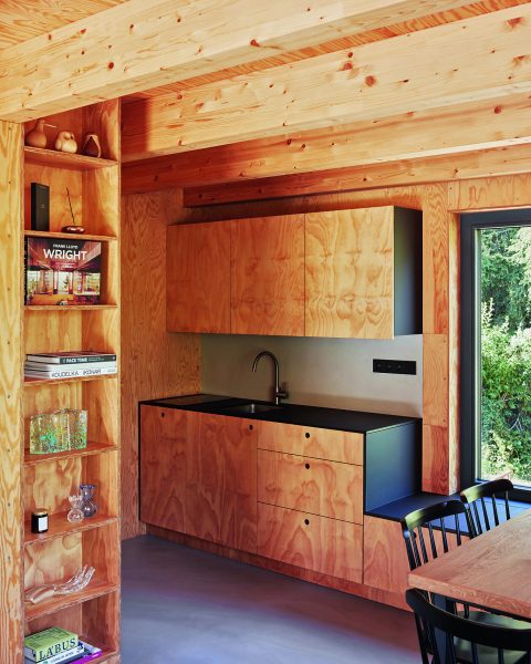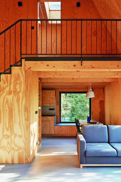 Zatímco tmavý exteriér pomáhá stavbě splynout s okolím, interiér je naopak světlý a s převahou dřeva. Použitá borová překližka s výraznou kresbou přechází ze střešních podhledů na stěny i veškerý nábytek. Barevně kontrastuje s fasádou a zároveň je praktická, protože do interiéru proniká více světla. „Chtěli jsme interiér, který evokuje klasickou chatu, takže použití borové překližky mi přišlo naprosto přirozené, její krásná žlutá ještě časem víc zežloutne,“ míní Martin Hajný. Na podlaze a stěnách koupelny je použitá nenápadná šedá stěrka.