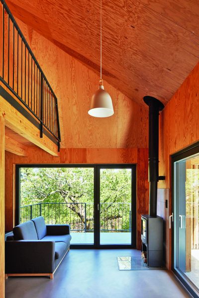 Z přízemí se otevírají výhledy do okolí velkými prosklenými plochami s orientací na jih a východ. „Navrhnout takhle malý dům, který má 30 m2, o jedné místnosti dole a jedné nahoře, to je specifická disciplína. Vzhledem k tomu, jak je ta dispozice jednoduchá, nám to dovolilo v přízemí použít okna ze všech stran. Tím jsme pak už neměli potřebu prosvětlovat víc prostor v podkroví,“ říká architekt.