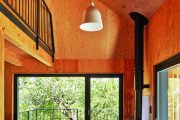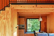 Z přízemí se otevírají výhledy do okolí velkými prosklenými plochami s orientací na jih a východ. „Navrhnout takhle malý dům, který má 30 m2, o jedné místnosti dole a jedné nahoře, to je specifická disciplína. Vzhledem k tomu, jak je ta dispozice jednoduchá, nám to dovolilo v přízemí použít okna ze všech stran. Tím jsme pak už neměli potřebu prosvětlovat víc prostor v podkroví,“ říká architekt.