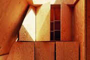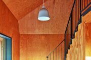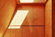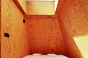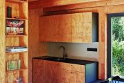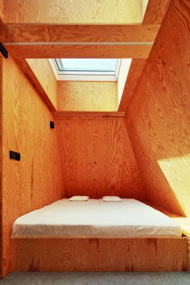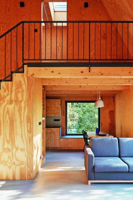 Zatímco tmavý exteriér pomáhá stavbě splynout s okolím, interiér je naopak světlý a s převahou dřeva. Použitá borová překližka s výraznou kresbou přechází ze střešních podhledů na stěny i veškerý nábytek. Barevně kontrastuje s fasádou a zároveň je praktická, protože do interiéru proniká více světla. „Chtěli jsme interiér, který evokuje klasickou chatu, takže použití borové překližky mi přišlo naprosto přirozené, její krásná žlutá ještě časem víc zežloutne,“ míní Martin Hajný. Na podlaze a stěnách koupelny je použitá nenápadná šedá stěrka.