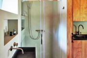 Koupelna se sprchovým koutem a umyvadlem od Gravelli. Na stěnách je cementová stěrka, foto: Radek Úlehla