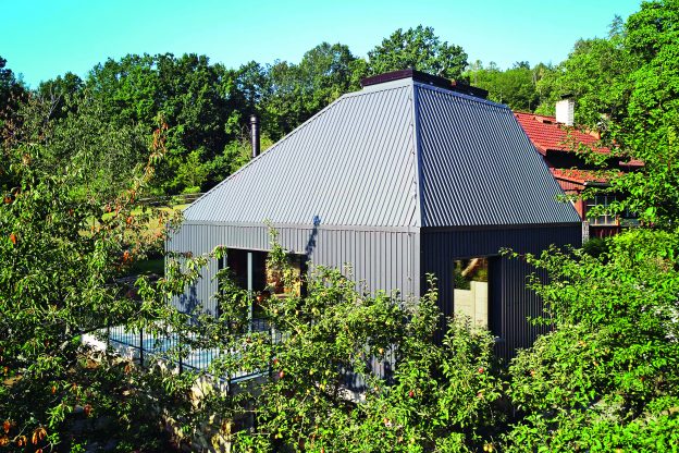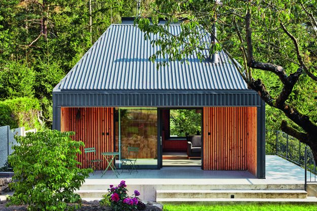 Chata v Posázaví, která byla dokončena v minulém roce, má fasádu z bezúdržbového plechu, hojně používaném na rozdíl od nás v Austrálii nebo na Novém Zélandu. Světlíky ve střeše vytvářejí meditativní prostor podkrovní ložnice.
