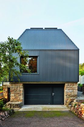 Architekt Martin Hajný reagoval na dané výzvy návrhem stavby atypického tvaru se seříznutou střechou. Důvodem byla minimalizace výšky a ohleduplnost vůči sousedům, kterým takto tvarovaná střecha nenarušuje výhled do krajiny. Z původní chatky tak zůstala jenom kamenná podezdívka, na které stojí nová plechová hmota. Hlavní konstrukce je sloupková, difuzně otevřená dřevostavba na železobetonové desce, která je posazena na železobetonových pilířích skrytých za kamennými stěnami. Střecha i fasáda jsou opláštěny trapézovým plechem, bezúdržbovým materiálem s dlouhou životností. „Pokud se týká zimního a letního provozu, je třeba myslet na to, že sloupková dřevostavba neumí akumulovat teplo. A s tím je třeba umět pracovat. V parném létě musí být tedy stále otevřená okna, což v kombinaci se sítěmi proti hmyzu a automatickým ovládáním střešních světlíků není žádný problém,“ vysvětluje architekt. V zimě je pak naopak třeba větrat rychle, stačí intenzivně kolem jedné minuty, aby teplo neuteklo,“ pokračuje.