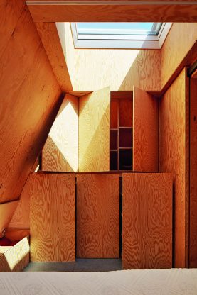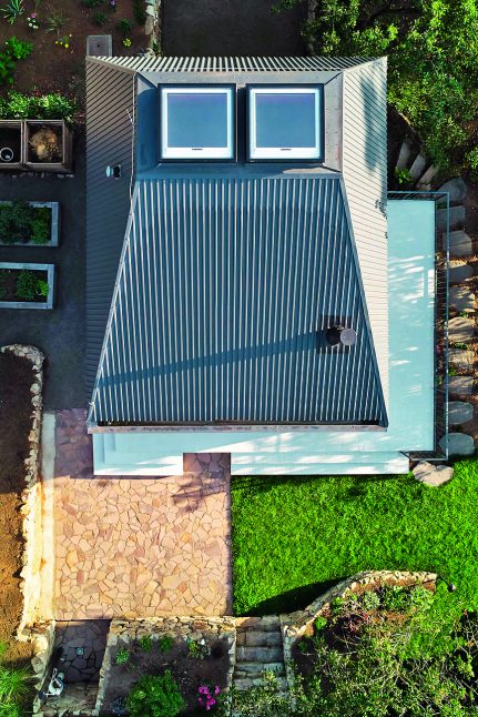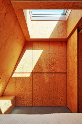 Seříznutá střecha naopak zůstala z vnějšího pohledu jednolitá, jakékoli vložení okna by narušilo jednoduchost domu při pohledu zvenku. Ložnice je tedy prosvětlena jen dvojicí otevíravých světlíků shora. Světlíky vytvářejí zajímavý meditativní prostor a umožňují rychlé komínové provětrání celého objektu. V kombinaci s výrazným přesahem střechy nad jižní částí je tak zajištěno příjemné vnitřní klima po celý rok.