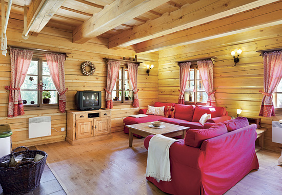 V chalupě pro hosty je velká světnice laděna do červena. Sedací nábytek pochází z IKEA, kanafasové závěsy na oknech jsou značky Textil Zítka