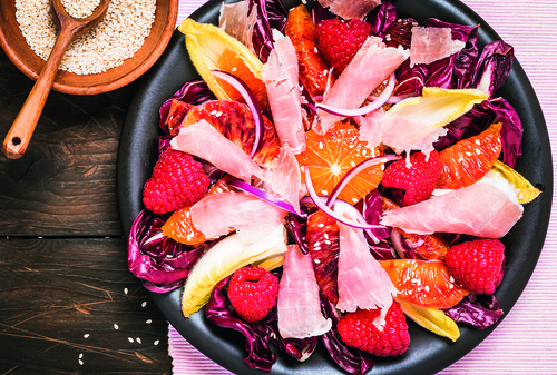 150 g listů z červené či žluté čekanky, 1 pomeranč, hrst malin, 1 červená cibule, 2 plátky šunky, 1 lžíce sezamových semínek, šťáva z citrónu, 3 lžíce olivového oleje, pepř a sůl