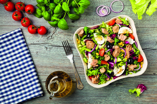 Salát natrháme, opláchneme a vložíme do větší misky. Šťávu nebo olej z konzervy vylijeme a tuňáka pomocí vidličky rozdělíme na kusy, které přisypeme k salátu. Stejně tak do misky přidáme nakrájenou cibuli, rajčata, vejce, v celku černé olivy a kukuřici. Zalijeme olivovým olejem a dochutíme čerstvou bazalkou a solí. Důkladně promícháme a můžeme servírovat třeba s opečenou bagetou.