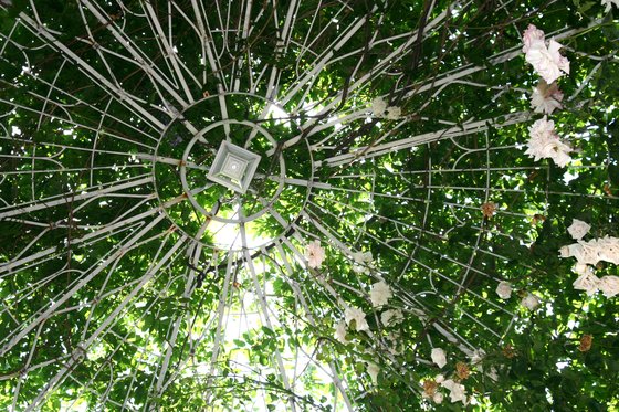 Majestátní kovová konstrukce vytvořila z růží něco jako zelený altán