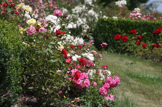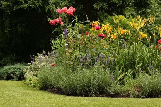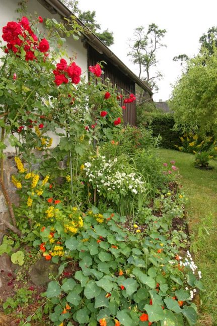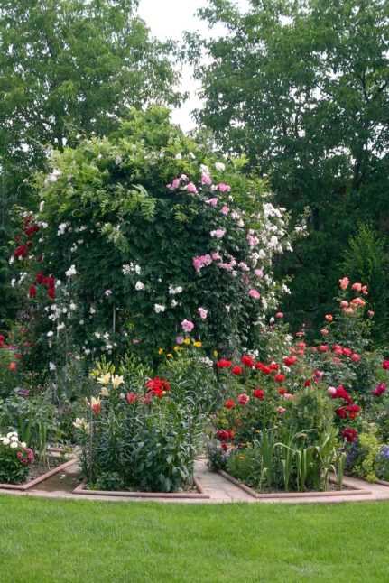Růže jako součást pestré výsadby může vypadat zajímavěji než celý růžový záhon