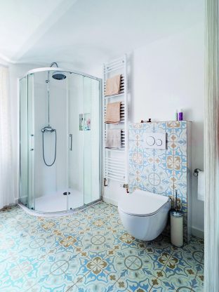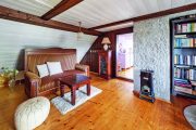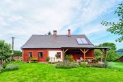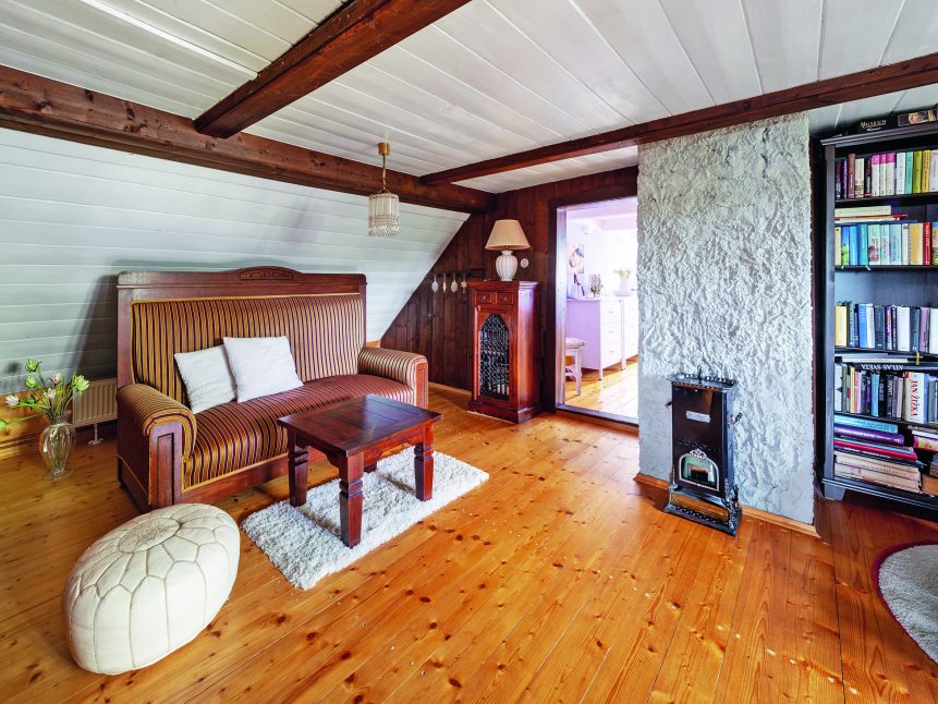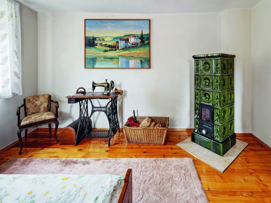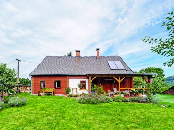 Zpočátku vytápěli jen hlavní světnici krbovými kamny. Do nich pak nechali přidělat výměník tepla, který žene ohřátou vodu do radiátorů ve zbytku domu. „K tomu fungují na střeše solární panely na teplou vodu, nechtěli jsme fotovoltaiku. Teplá voda se nám ohřívá ale i v bojleru. Takže například na jaře a na podzim, když je přechodové období, umí systém topit třeba čtyři hodiny do chalupy solárem – ohřátá voda jde do ústředního topení a do jediného podlahového v koupelně. V zimě, kdy není sluníčko, běží do topného okruhu zapojený elektrokotel, a pokud k tomu zatopíme v kamnech, tak začne z výměníku proudit teplá voda do systému a elektrokotel se vypne. Když si jdeme večer lehnout, přestaneme přikládat a kamna v noci vyhasnou. Elektrokotel pozná, že je studená voda a začne přitápět,“ vysvětluje majitel.