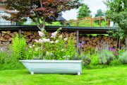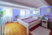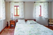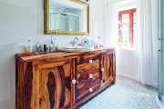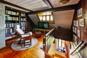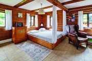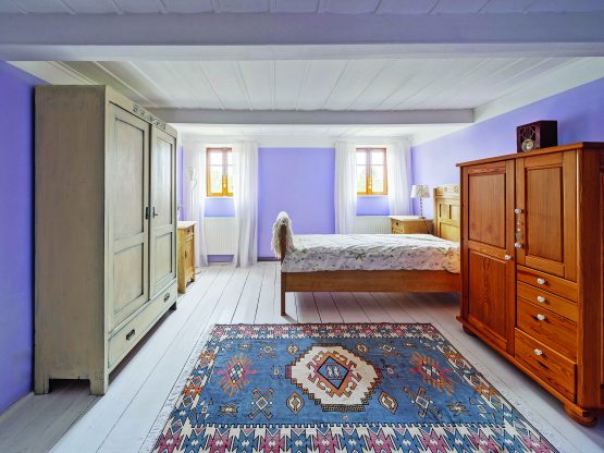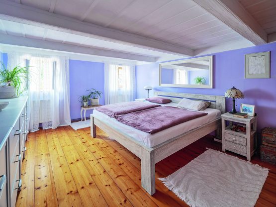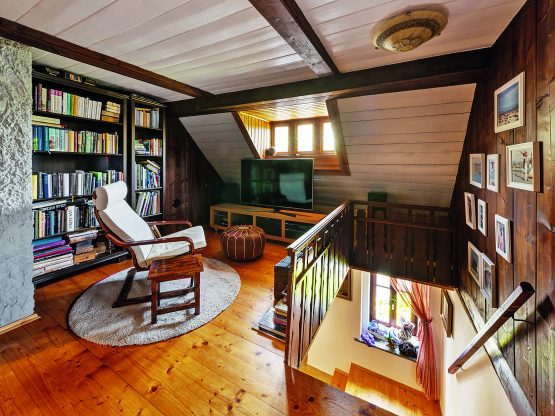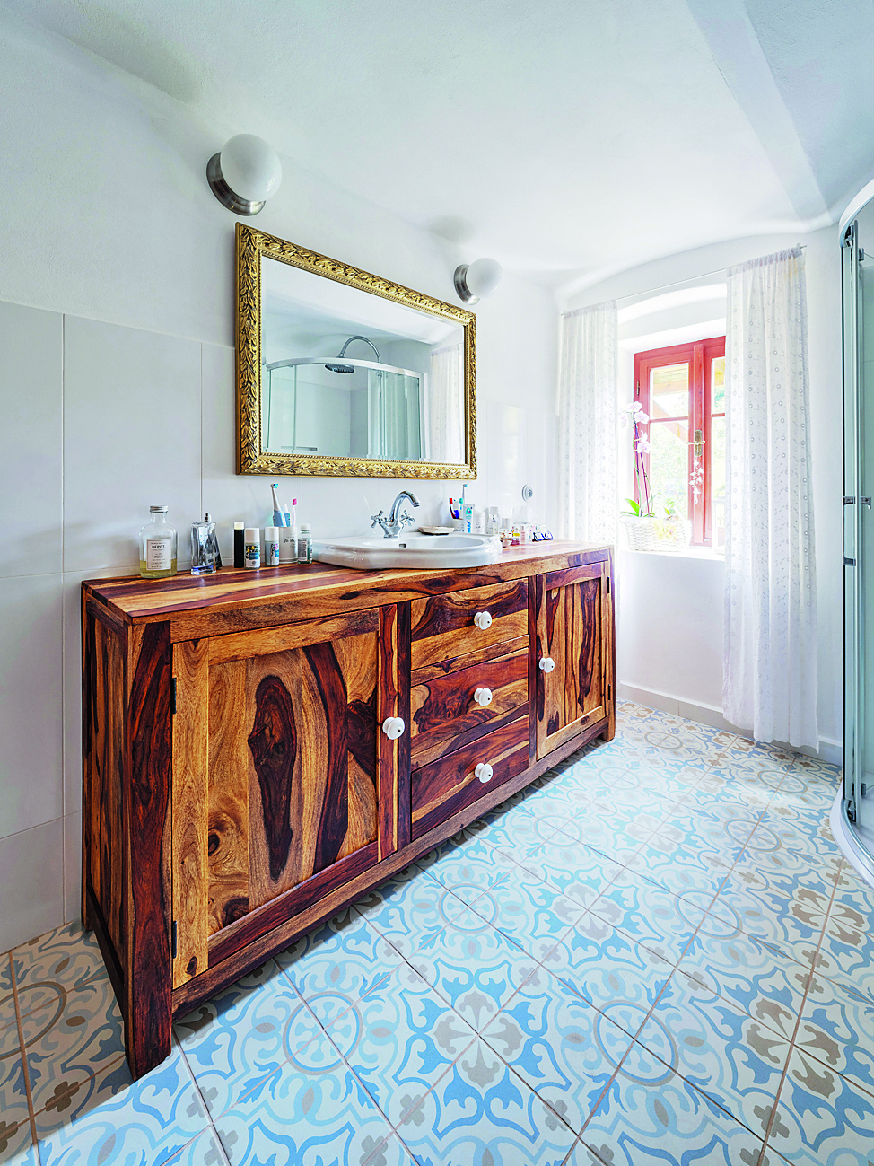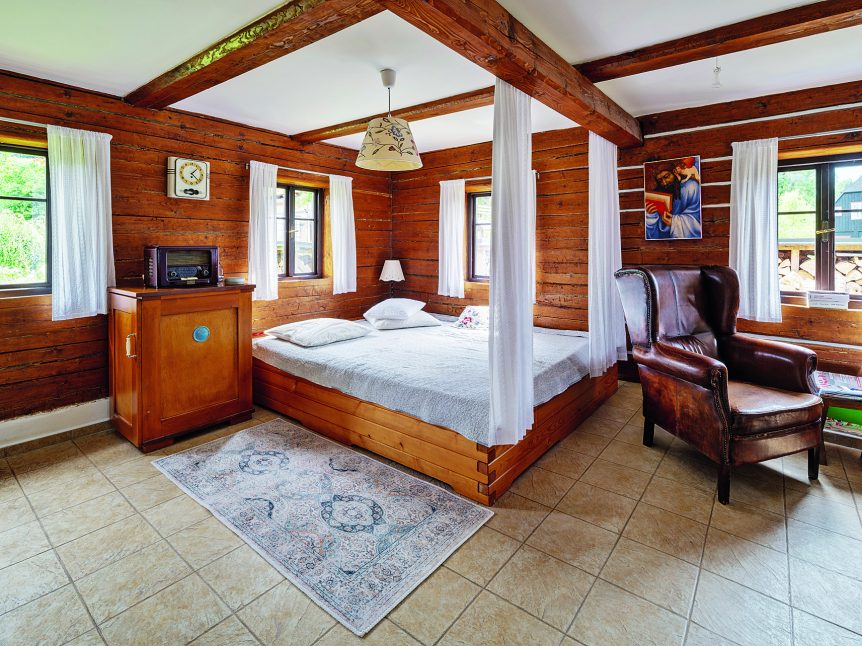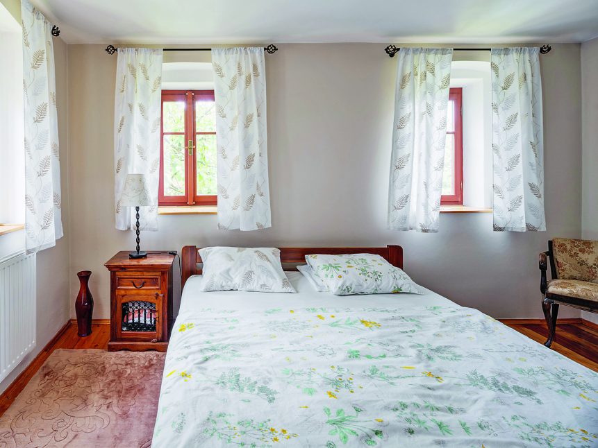 V chalupě manželé ponechali některý původní nábytek. Patří do něj třeba skříň ve světnici, která byla už tehdy vyrobena tak, aby se dala při stěhování rozložit na dvě půlky, nebo postel v patře s čely, prodloužená na přání manželů truhlářem. Historická je i kuchyňská linka, do níž Karin použila místo prosklení králičí pletivo, inspirovala se tehdy v časopise Elle Decoration. Nový nábytek vybírali většinou z jejich oblíbeného sheeshamového dřeva, jednoho z druhů palisandru. Vkusně zvolila Karin také textil, zejména pro závěsy připomínající krajku, které na míru ušila. Nejnovější je v domě koupelna, tu promysleli tak, aby i na 9 m2 a s jedním malým oknem poskytovala dostatek světla. Umyvadlo si Petr precizně vsadil do desky komody sám, pečlivě řešil též osvětlení směřující do všech stran.