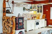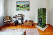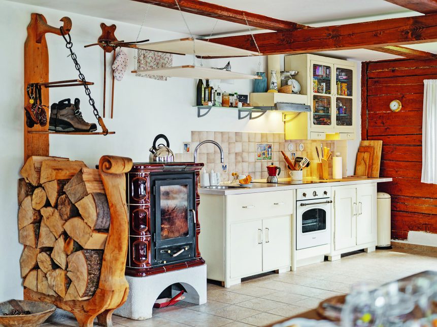 Kachlová kamna s výměníkem s originálním stojanem na dřevo a sušákem na bylinky u stropu, foto: Tomáš Dittrich