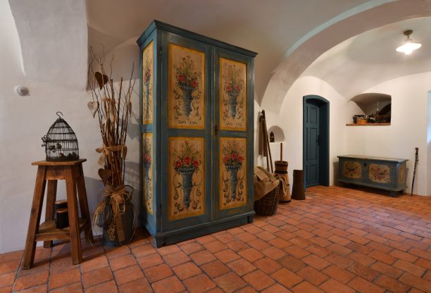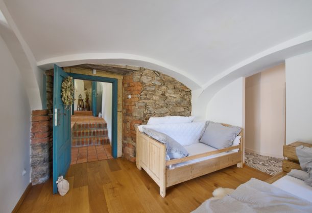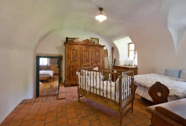 Ze síně vydlážděné starými topinkami se od vstupu doprava vchází do ložnic. Zatímco v první jsou na podlaze topinky jako v síni, v další ložnici s třemi postelemi, kam se sestupuje po několika schůdcích, jsou široká prkna.