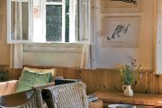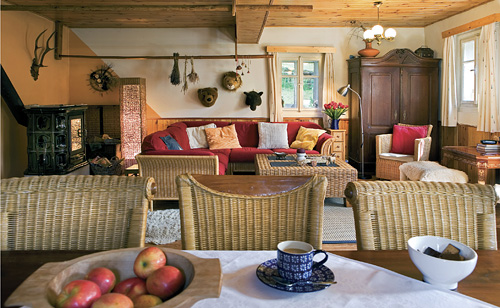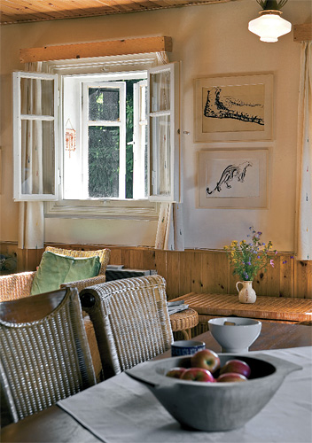 Nábytek v interiéru je velmi pohodlný a vzdušný. „Veškeré čalouny jsou prací, což je v chalupě potřeba,“ dodává Alice. „K ratanovým židlím jsme pořídili velký teakový stůl pro osm lidí. Ale i ten je nám občas malý. Sedací rohovou soupravu, také z ratanu, si nemohu vynachválit. Jejich výhoda spočívá v tom, že pokud se někomu na poslední chvíli nechce odjet do města, může na ní velmi pohodlně přespat.
