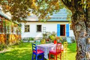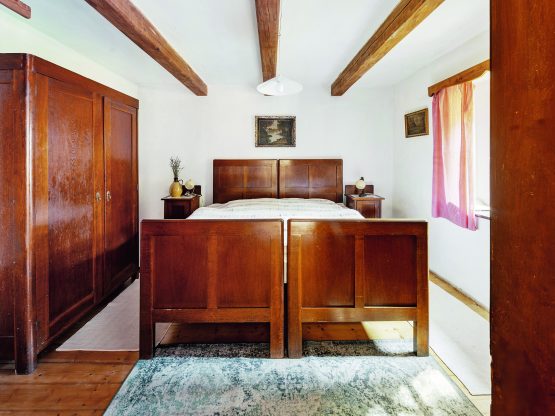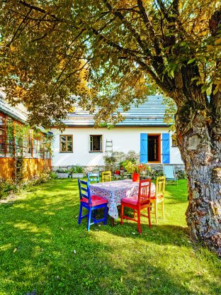 Ivana sem jezdí od svých šesti let. Rodiče chalupu koupili v roce 1974 a o víkendech ji svépomocí zvelebovali až do devadesátých let. Tatínek, zručný kutil, dělal všechno sám, opravdu se tu s maminkou nadřeli. Na pozemku tehdy stála jen stará stodola se zachovalou střechou. Rodina ji postupně přestavěla – vznikla světnice, ložnice a malý kamrlík. Kolmo ke stodole kdysi stával ještě jeden dům, ale ten byl při koupi už zbořený a zůstala po něm jen hromada kamení. „Ty kameny využil táta mimo jiné na stavbu zápraží ke stodole, dnes jí říkáme starý dům. Vtipné je, že rodiče objevili až po několika měsících za hromadou sklep,“ popisuje Ivana začátky chalupaření. „Pamatuji si, že na zahradě byl kozí chlívek a obrovské sáně, které se v minulosti zapřahaly za koně, a my holky si na nich hrály. Naši se také vždycky pohádali, že jsou v posteli myši a máma jednou prohlásila, že už sem nikdy nepojede. A tak táta vyrobil pořádné dveře do ložnice, které tam slouží dodnes,“ směje se paní domu.