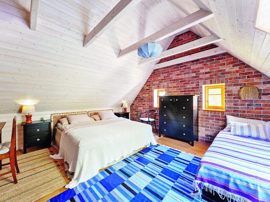 Architekti původně navrhovali celoprosklený štít, ale manželé trvali na oknech zasazených ve štítové zdi tak, jak je v kraji zvykem – lehce vyosených. „Okna v nové části jsou navíc o něco menší než v té původní, takže z cesty vypadají stejně velká,“ dodává. Díky promyšleným detailům tak na první pohled nepoznáte, že je část domu nová. Celkovému dojmu pomohla i výměna střechy původní stodoly, na kterou použili stejnou krytinu jako u nového domu – betonovou tašku Bramac. Zkolaudováno bylo v roce 2021. Nový dům tak postavili a starý zrekonstruovali – obojí včetně obytných podkroví – během jednoho roku. Termínem dokončení byla svatba jedné z dcer, plánovaná na léto. „Bylo skvělé mít takový deadline. A navíc tehdy na jaře pršelo, takže rozkopaný pozemek rychle zarostl trávou,“ usmívá se Ivana.