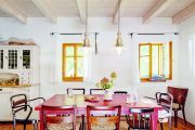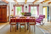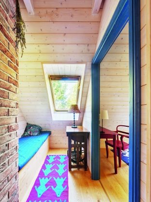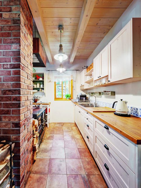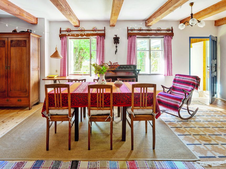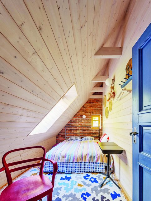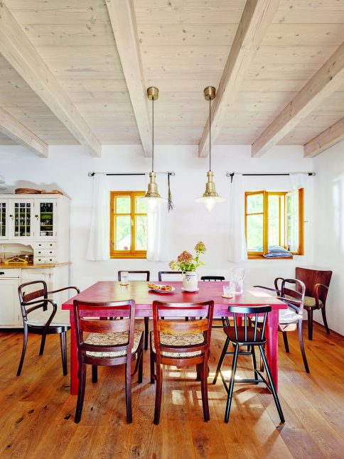 Paní domu se nebojí barev ani nátěrů, ráda renovuje starší nábytek a v chalupě si dovolí víc než doma. Má za sebou dokonce kurz patinování, takže je v tom odborníkem. Pečlivě dbá také na doplňky. Třeba talíře a hrnky sbírá na burzách v nedalekém Vlastkovci – výhradně karlovarský porcelán, aby bylo nádobí jednotné. A když u vlastnoručně nabarveného stolu sedí malí loupežníci – vnoučata – a upíjejí ze starodávných hrníčků, je to radost pohledět.