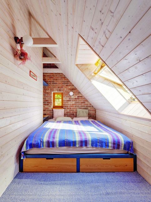 Ložnice Vojtěcha a Ivany v nové části domu. Vzduch se zavlažuje průduchy ve stropě, dole se topí krbovými kamny, foto: Tomáš Dittrich