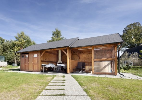 Naproti chalupě v zahradě stojí letní kuchyně, kde se hosté prohřejí ve finské sauně nebo zrelaxují v koupacím sudu. V létě je k dispozici i nadzemní bazén, který užijí hlavně děti. Foto: Jaroslav Hejzlar