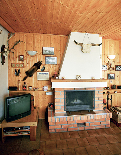 Na stavbu krbu si Milan pozval odborníka. Stěny kolem zdobí četné lovecké trofeje a staré fotografie