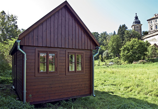 Vlastně je tak trochu schovaná, takže ten, kdo pronikne za vysokou zeď klášterní zahrady, ji může lehce přehlédnout. Dřevostavba stojí těsně u zdi a přímý pohled na ni zakrývají bezové keře. Majitelka, Lucie Virostková, vysvětluje, že byla velmi ráda, když se jí podařilo objevit typ domu, který by vyhovoval jak jí, tak památkářům. Ti, poté co byl v roce 2010 celý areál vyhlášen národní kulturní památkou, žádnou novou stavbu v klášterní zahradě nepovolili. Tato chatka ale přání všech splnila.