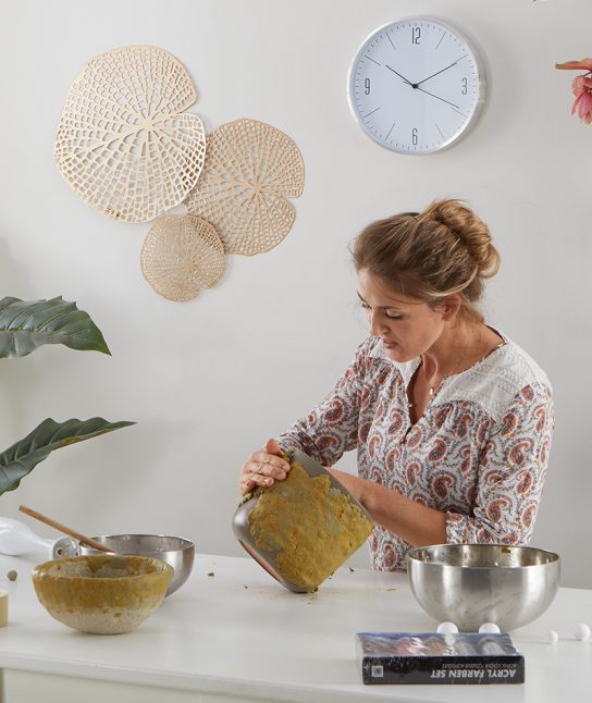 Když máme hmotu na papírmaš připravenou, můžeme začít tvarovat svůj dekorativní předmět. My jsme si pro upcyklaci vybrali starou vázu, misku i květináč. V zásadě jsou dvě možnosti: Buď vybraný předmět obalíme do vytvořené hmoty a vytvarujeme z ní novou originální vázu, nebo použijeme nějaký předmět, např. misku, pouze jako formu, která se následně odstraní. Taková forma by měla být z materiálu, který je voděodolný a nerozpustí se při kontaktu s vlhkostí.
