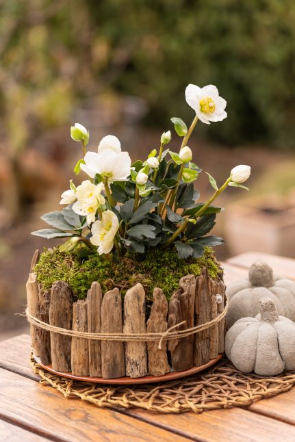 Nejpřirozenější výzdobu obstarají květy otužilých rostlin a dřevin vysázených ve volné půdě i v nádobách. Patří mezi ně čemeřice s okvětními plátky zbarvenými kromě nejběžnější bílé ještě zeleně, žlutě, oranžově, růžově, nachově či fialově, dále pak skalkové bramboříky s motýlkovitými květy v cyklámenové barvě, sytě žluté talovíny, bílé, žluté či fialové krokusy, zimní jasmín s kaskádami žlutých kvítků a vilín s vonnými žlutými, oranžovými či červenými květenstvími. Rovněž barevné plody šípkové růže, jeřábu, skalníku a pámelníku signalizují, že zahrada v zimě žije.