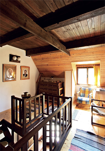 Pěkná špaletová okna prý tenkrát vyráběl truhlář z Jizbice u Dobrošova přesně podle starých. I v tomhle Urbánkovi dodrželi původní filozofii stavení. „Není tady sice moc světla, ale menší okna jsou zase výhodná kvůli teplu,“ chválí si Petr. „Do konstrukce krovu jsem se samozřejmě nehrnul, ten spáchal pan Troutnar, tesař z Náchoda. A na střechu, kdysi doškovou, jsme položili betonky z Hodonína. Tenkrát s nimi začínali. No a pak jsem obložil předek chalupy bytelnýma fošnama.“ Ta informace mě zvedla od kávy. Musela jsem se jít podívat na nároží, kde jsem při příchodu letmo zaregistrovala spoj na rybinu… A zjistila jsem, že ta roubenka opravdu není roubená!