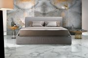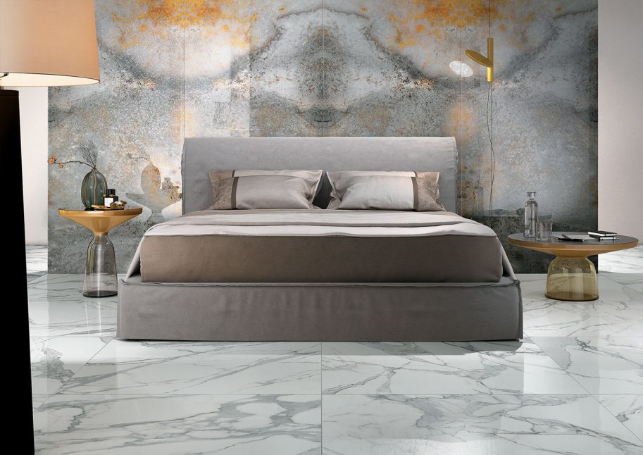 Dlažba imitující mramor Jewels vypadá perfektně i za čelem postele, kde připomíná umělecké dílo.