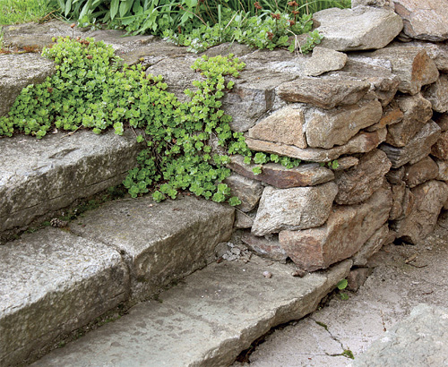 „Kamení pochází z výkopů pro kanalizaci, stačilo jen poprosit firmu, aby kameny vozila místo na skládku ke mně,“ libuje si pán domu. Val je skládaný nasucho, je půl metru široký a práce na něm trvala půl roku.