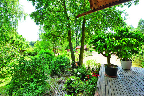 V zahradě dominuje rybník, jehož travnaté břehy jsou osázeny keři a okrasnými travinami, tu a tam si v trvale vlhké zemině libují i zakrslé vrby. Pozornost upoutají porůznu ve skupinách umístěné žulové kameny, které nejen zdobí, ale slouží i jako sedátka, když si někdo chce užít pohled na zelenomodrou hladinu. Bažinaté části břehu lze přejít po dvou můstcích inspirovaných japonskými tradicemi. V horní části pozemku kolem domu převažují břízky, dole akáty. Objevili jsme i třešeň a pár borovic.