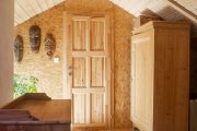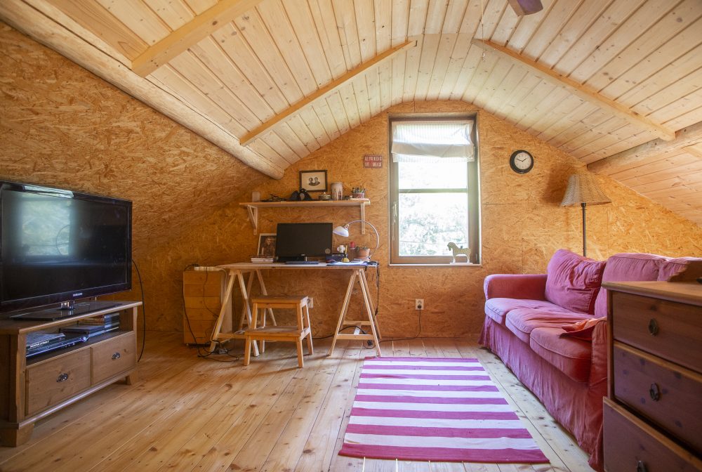 Ve skutečnosti jde o velmi jednoduchý dům, který zevnitř působí mnohem prostorněji, než by se mohlo zdát při pohledu zvenčí. Původně měl poskytnout pohodlné zázemí pro malou rodinu, dnes už je vše trochu jinak. Zvenčí jeho vzhled každopádně určuje charakteristická nepravidelnost nesámovaných smrkových desek, zatímco v interiéru jsou stěny obloženy stále častěji používanými OSB deskami. „Měli jsme v plánu ještě je něčím pokrýt nebo obložit, takže jsme bohužel nepoužili desky s perem a drážkou. To byla jedna z mála věcí, kterou bych dnes dělala jinak. Zarytí ekologové je za přírodní materiál nepovažují, ale mně se líbí.“