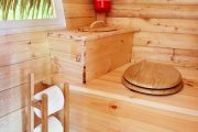 Jsme zpátky na zemi a rozhlížíme se kolem. K ohništi na place vydlážděném kameny je to pár kroků. U stolu a lavic vyrobených z kulatiny je připraven i gril. Opodál stojí sprchová kabina a suchý záchod. Stejně jako v chatě i tady jsou na stěně záchodu nádržka na vodu, umyvadlo a mýdlo. Všechno je na dohled, ale v dostatečné vzdálenosti, takže soukromí je zachováno.