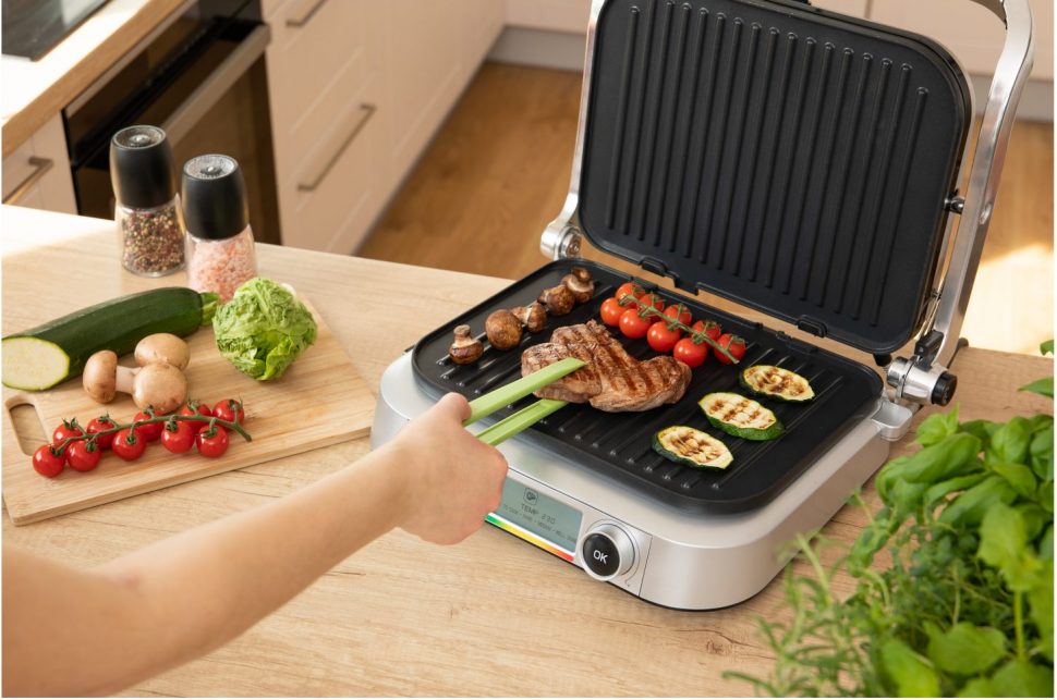 Pokud nechceme na balkónu „udit“ kouřem sebe či případné sousedy, můžeme používat elektrický gril, který využijeme celoročně i doma. Rozhodně nejde o z nouze cnost, protože se s pomocí moderních technologií změnil na všestranného pomocníka. Takzvaný chytrý kontaktní gril je vybaven teplotními senzory v grilovacích deskách, které dokážou rozpoznat pokles teploty při položení suroviny na gril a vyrovnat ho navýšením teploty v nich. To je důležité zejména při grilování masa, kdy každá minuta nebo stupínek ovlivňují výsledek. Gril díky automatickým senzorům rozpozná i tloušťku připravovaného masa, sýru či zeleniny a podle ní přizpůsobí čas a teplotu grilování. Jednotlivé fáze pečení se zobrazují na přehledném LCD displeji.
