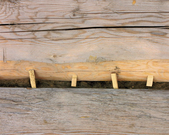 Pokud chceme hliněnou omítkou opravit spáry mezi trámy, je nutné dřevo nejprve mechanicky upravit tak, aby se omítka měla o co zachytit. Do spár je například možné natlouci dřevěné kolíky a proplést je ocelovým drátkem. Pak bude omítka držet bez problémů. Stejně tak je nutné postupovat při nanášení hliněné omítky na trámový podklad. Nutné je buď zdrsnění dřeva nebo připevnění latěk a rákosových rohoží, na něž se omítka zachytí. Pro větší odolnost je dobré do ní ještě zapracovat jutovou tkaninu.
