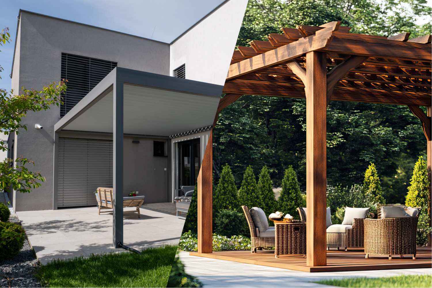 Hliníková a dřevěná pergola – rozdíly v konstrukci, vzhledu a dlouhodobé odolnosti.