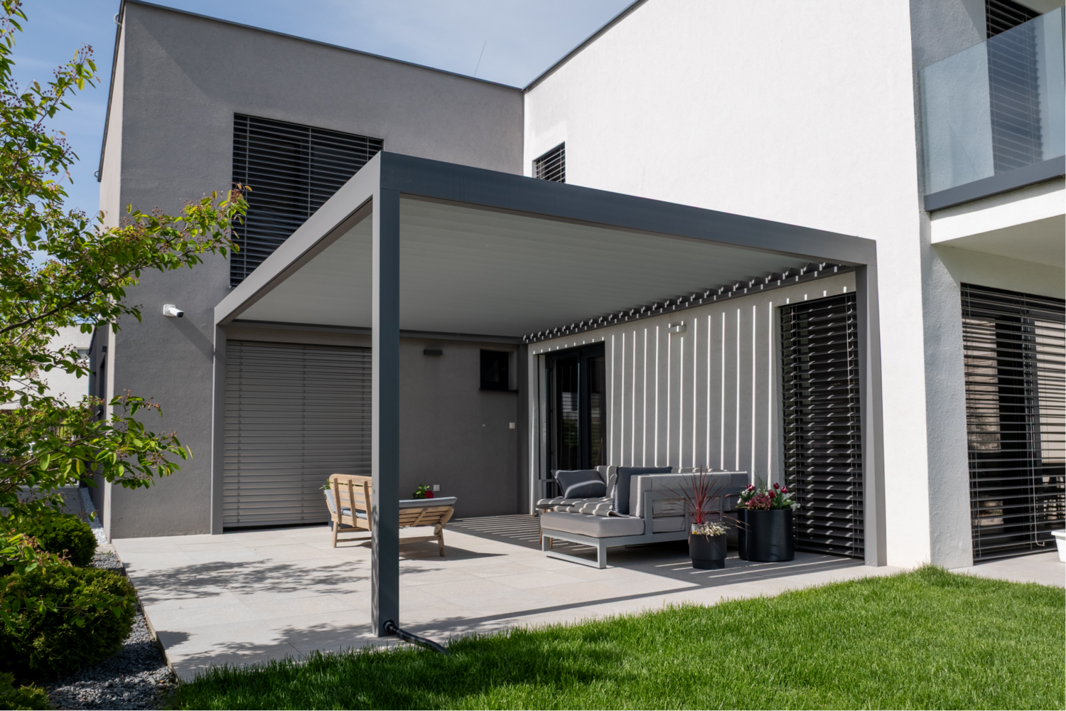 Hliníková pergola není jen praktická, ale i designová. Díky čistým liniím a RAL barevnosti se hodí k moderní novostavbě i ke klasickému rodinnému domu.