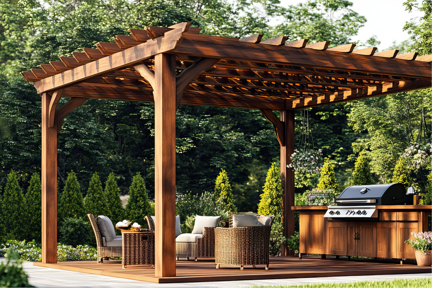 Dřevěná pergola nabízí přírodní vzhled, vyžaduje však pravidelnou údržbu a ochranu proti vlhkosti.