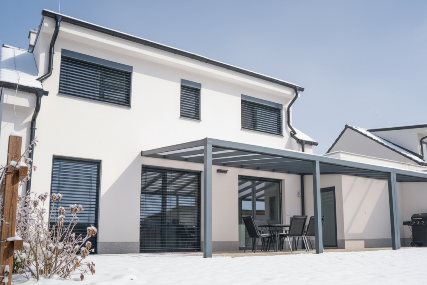 Hliníková pergola v zimních podmínkách – stabilní konstrukce a vysoká odolnost vůči sněhu a mrazu.