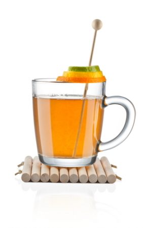Tekuté ingredience zahřejte, nalijte do hrnku či sklenice z varného skla a ozdobte plátky pomeranče, citronu a limety.