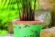 Na mozaiku používáme buď keramické, nebo skleněné střípky, někdy ji můžeme oživit i vloženými korálky, skleněnými čočkami a podobně. Ozdobíme tak podnos, rám zrcadla, květináč, víko truhličky nebo dózy, desku stolu či skříňky… Kromě menších věcí lze udělat z mozaiky například i celou stěnu v koupelně.