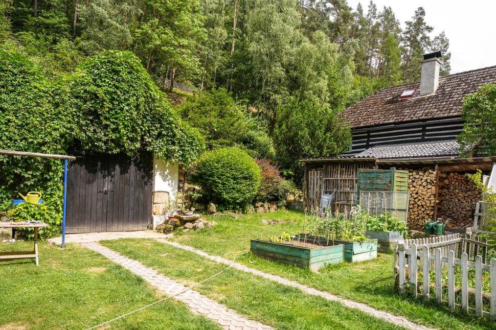 Chalupu obklopují pečlivě upravené záhony se zeleninou, okrasnými keři i květinami. O ty zeleninové se stará Jiří. I když je pozemek ve strmém svahu, založil zde malá políčka, kde pěstuje brambory, cibuli, česnek a další zeleninu. S vlastní úrodou někdy vystačí až do jara, pochvaluje si Helena. Nechybí ani místo pro odpočinek – malá teráska nad chalupou je skrytá pohledům sousedů i kolemjdoucích. Právě tohle zákoutí naše hostitelka často vyhledává, když si chce vychutnat ničím nerušenou chvilku s knížkou.
