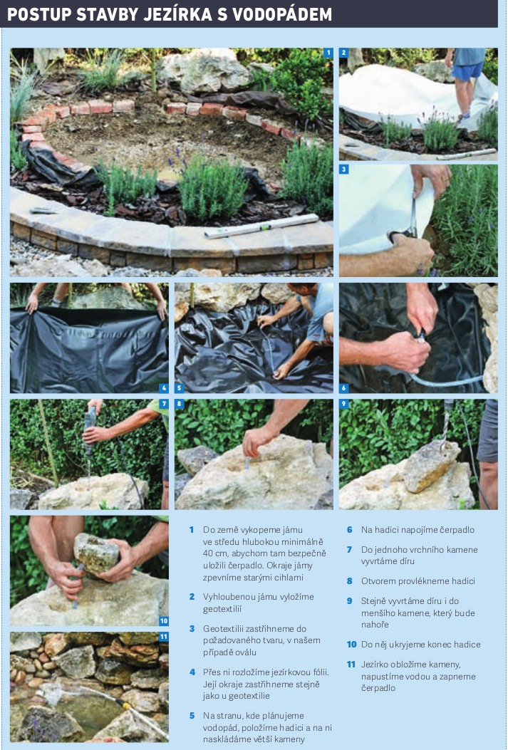 Pro jezírko s vodopádem zvolíme na zahradě vhodné místo. Mělo by být pěkně „na očích“, aby se dalo pozorovat například z lavičky nebo jiného za- hradního posezení. Dostupný by měl být přívod vody. Podle velikosti budoucího jezírka si nashromáždíme různě velké kameny – na samotný vodopád větší kusy lámaného kamene, na dně a okrajích jezírka můžeme střídat lámaný kámen s drobnými oblázky i většími valouny. Změnou kompozice naskládaných kamenů měníme proud stékání vody. Čím širší a plošší kámen umístíme navrch sestavy, tím víc bude proud vody připomínat malý vodopád. Hotové jezírko do- plníme výsadbou vodomilné zeleně.