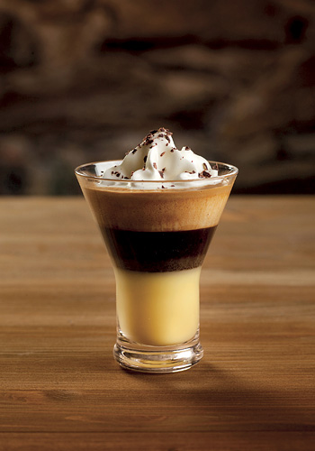 Vaječný likér s rumem ohřejeme a nalijeme do menší skleničky. Pomalu přilijeme horké espresso – nejlépe přes lžičku po stěně skleničky. Vrstvy tak zůstanou krásně oddělené. Nakonec ozdobíme šlehačkou.