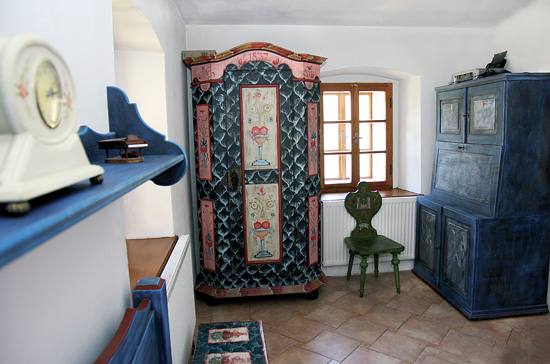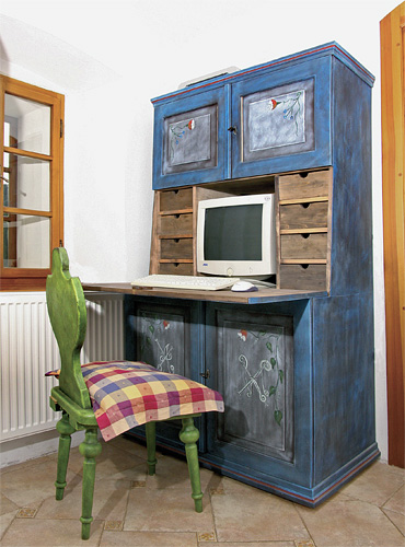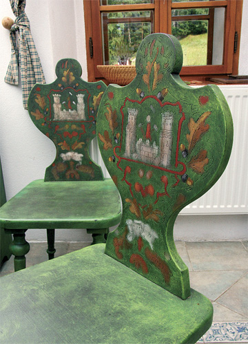 V celém domě přitahuje pozornost dřevěný malovaný nábytek. Nejprve dal manželský pár vyrobit na míru kuchyňskou linku. „Usoudili jsme, že sice chceme co nejstylovější nábytek, ale linka musí být především praktická,“ vzpomíná doktorka Jitka Vydrová. „Mezitím jsme objevili zdejšího truhláře pana Brože, a řezbáře pana Hracha, kteří dovedou vyrábět krásné patinované repliky nábytku s věrnými malbami. Židle vznikly podle předlohy z kašperskohorské radnice a nesou malovaný znak tohoto města.
