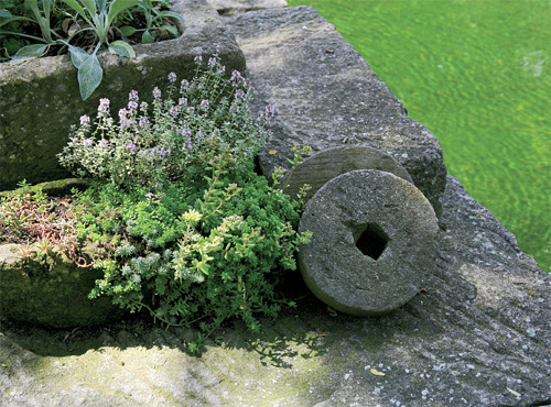 Čistotě vody napomáhá i fontánka, vytvořená ze starých mlýnských kamenů. Okysličuje vodu a omezuje tak růst řas. „Už si bez ní nedovedeme zahradu představit,“ říká naše průvodkyně. Zurčení fontánky je slyšet i v altánu vedle jezírka, kde se v létě za velkého horka příjemně odpočívá pod rákosovou střechou.