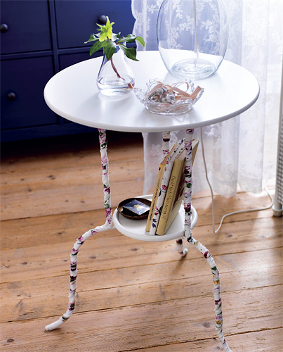 Chcete-li něco jednoduššího, nastříhejte nebo natrhejte látku vhodné barvy a zvoleného vzoru na užší či širší pruhy. Těmi pak oviňte nohy u stolku, opěradlo u židle, sedák u stoličky nebo aspoň obrazové rámečky.