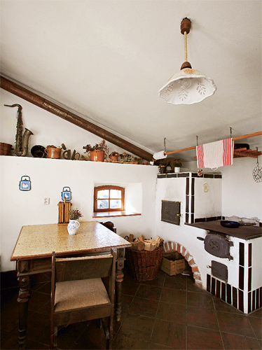 Kachlová kamna do jednoduché kuchyně v rekonstruovaných chlívcích postavil Tomáš po řádném nastudování postupu sám