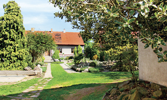 Zahrada pana Bartůňka se rovným dílem dělí na užitkovou a skalkovou část. Obě měří zhruba po 300 m2, i když ta okrasná se díky četným zákoutím na terase zdá větší. Připočteme k nim ale ještě přístupovou cestu určenou pro vjezd aut, která není ledajaká…
