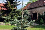 Skalka potřebuje obojí. Umění je vytvořit drobným rostlinkám tu správnou míru osvětlení i zajímavě zapojit dřeviny do kompozice. A tak ve volném prostoru zahrady nenacházíme mnoho vzrostlých dřevin, majitel je však hojně použil k odstínění okolních stavení, kterých v průběhu let jeho příbuzní na velkém rodinném pozemku postavili hned několik.